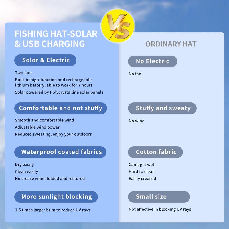 El ventilador integrado funciona con energía solar y se activa automáticamente al exponerse a la luz solar directa. Proporciona un flujo de aire constante para mantenerte fresco, sin necesidad de botones, pilas ni carga.